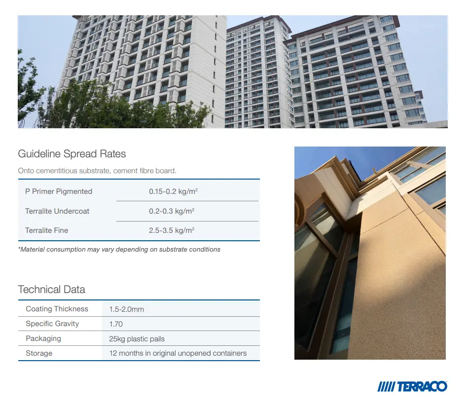 Roller apply one coat of Terraco P Primer Pigmented and allow to cure. Roller apply one coat of Terraco Terralite Undercoat and allow to cure. Trowel apply Terraco Terralite Fine to colour and texture as per approved architectural sample.